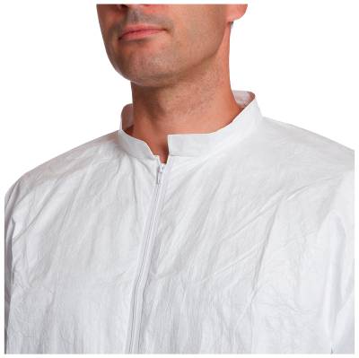 White laboratory coat with collar. Specifically designed for use with other Tyvek® garments. Areas of application include: pharmaceutical handling, chemical protection, lead and asbestos abatement/remediation, general maintenance/operations, spray painting and general clean-up.