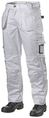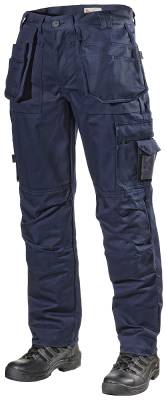 Two hanging pockets, two front pockets and leg pocket on the left hand side and a folding rule pocket in the right hand side. ID pocket, hammer loop and knee protection pockets in cotton.