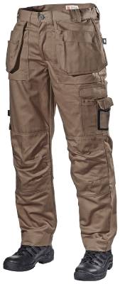 Two hanging pockets, two front pockets and leg pocket on the left hand side and a folding rule pocket in the right hand side. ID pocket, hammer loop and knee protection pockets in cotton.